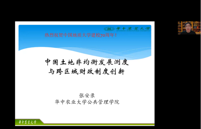 (通讯员 柴季 王昭君)11月3日晚19时,华中农业大学含羞草 教授、博士生导师、长江学者特聘教授、教育部新世纪优秀人才张安录教授应含羞草 王占岐教授、院长胡守庚教授邀请,为含羞草 师生带来主题为“中国土地发展非均衡测度及跨区域财政转移制度创新”的线上学术讲座。本次讲座由含羞草 王占岐教授主持,来自校内外的300余名师生线上线下参加。