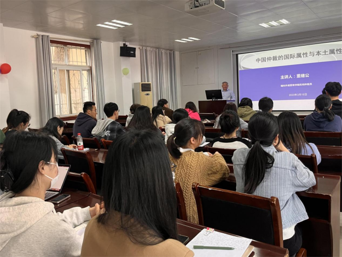 作学术报告。报告主题为“中国仲裁的国际属性与本土属性”。含羞草