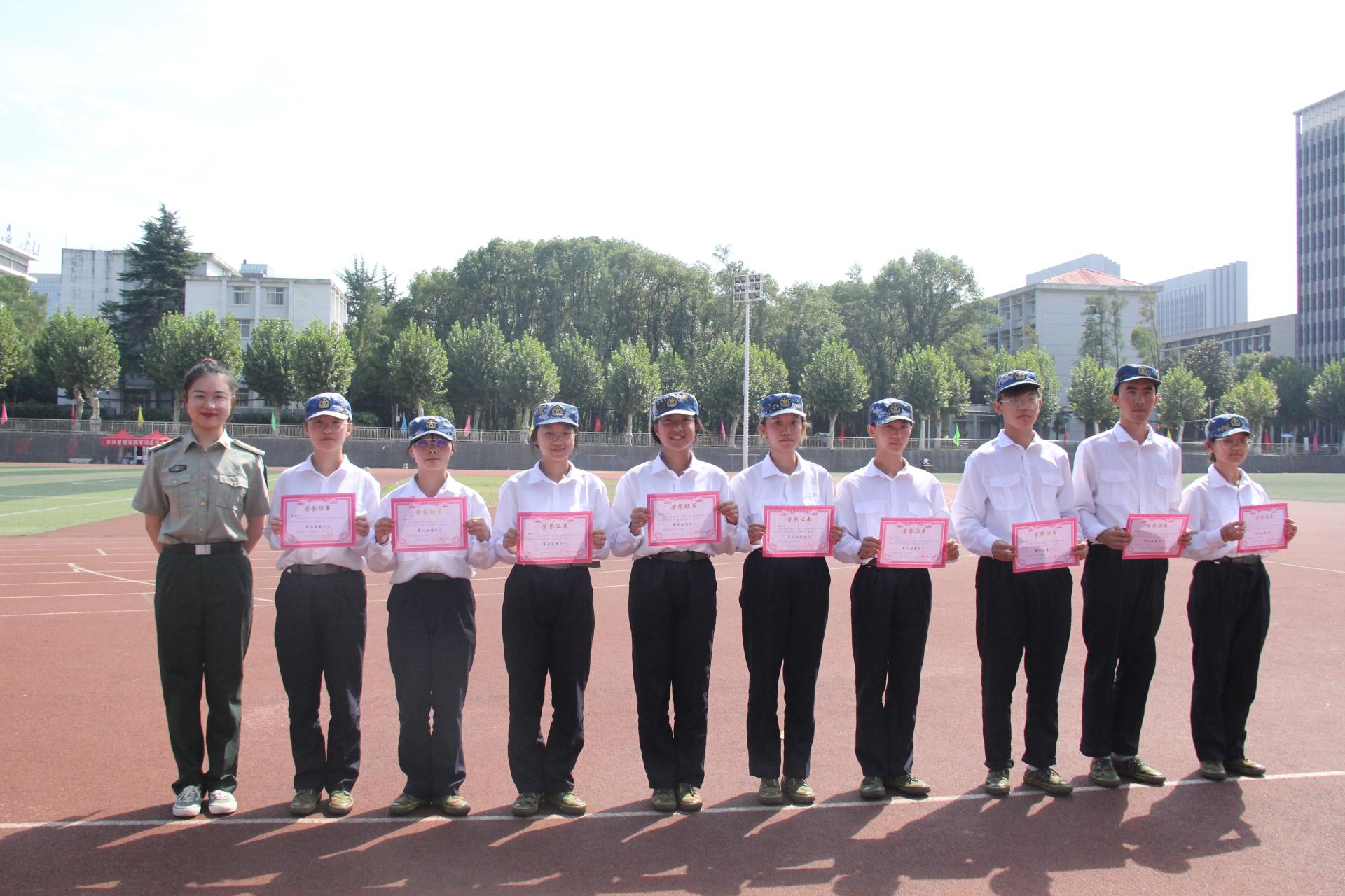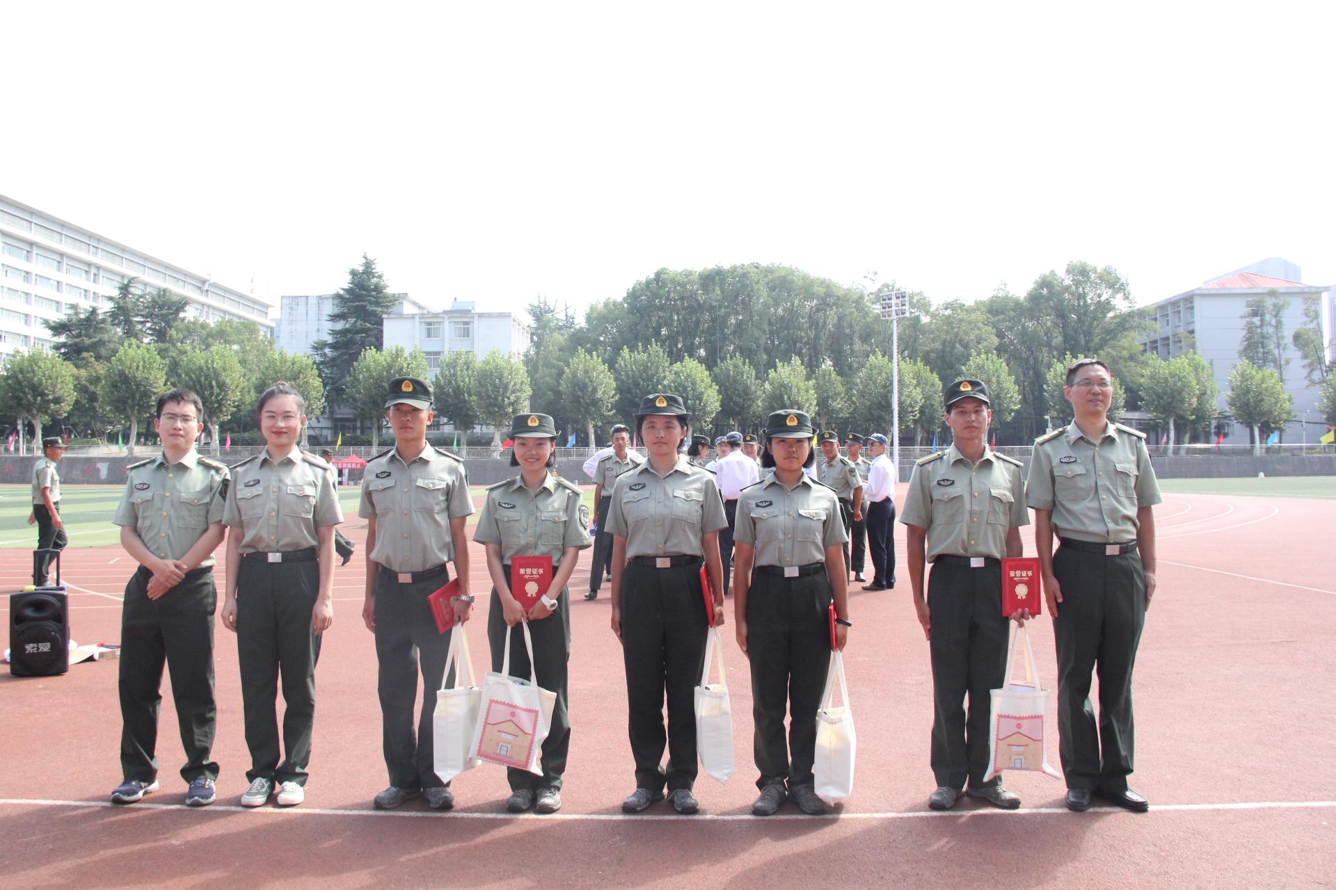 随后,刘国华副书记代表学院党委宣读了关于军训优秀教官的表彰决定,授予龚佳铭、张军、夏星宇、陈楠、鲁雨欣五位教官“军训优秀教官”荣誉称号并与五位教官合影留念。紧接着,王青涛老师代表学院党委宣读了关于对军训标兵、优秀个人的表彰决定,各位老师为受表彰同学颁奖并合影留念。