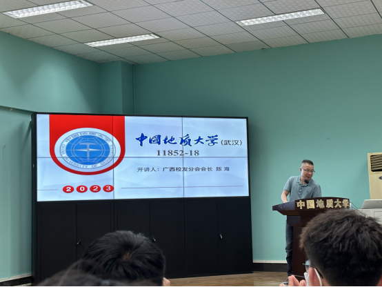 讲座中,陈海校友讲述了自己的经历,用自己的故事启迪同学们。他早期从事地质找矿与矿产勘查技术管理、研究工作,对广西云开地区成矿地质条件及成矿区划科研、广西河池地区找矿远景与实践、广西环江县北山、下巴、上朝铅锌矿深部找矿研究等等工作做出了重要贡献。陈海校友除了在学术研究方面有重大贡献,他在离开体制后创建了广西南宁榜样矿业(集团)咨询有限责任公司,其旗下公司包括广西南宁全桂矿业投资咨询有限公司等6家子公司。