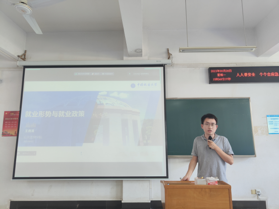 最后,2024届毕业研究生辅导员王青涛向与会师生介绍当前就业形势和就业政策。王青涛老师从就业形势、学院往届专业就业去向和有效求职渠道三个方面,用数据和图表全面深度地剖析了2024届毕业生将要面临的就业形势,并针对同学们重点关注的就业信息获取、应届生身份等问题提供了具体详细的解答。