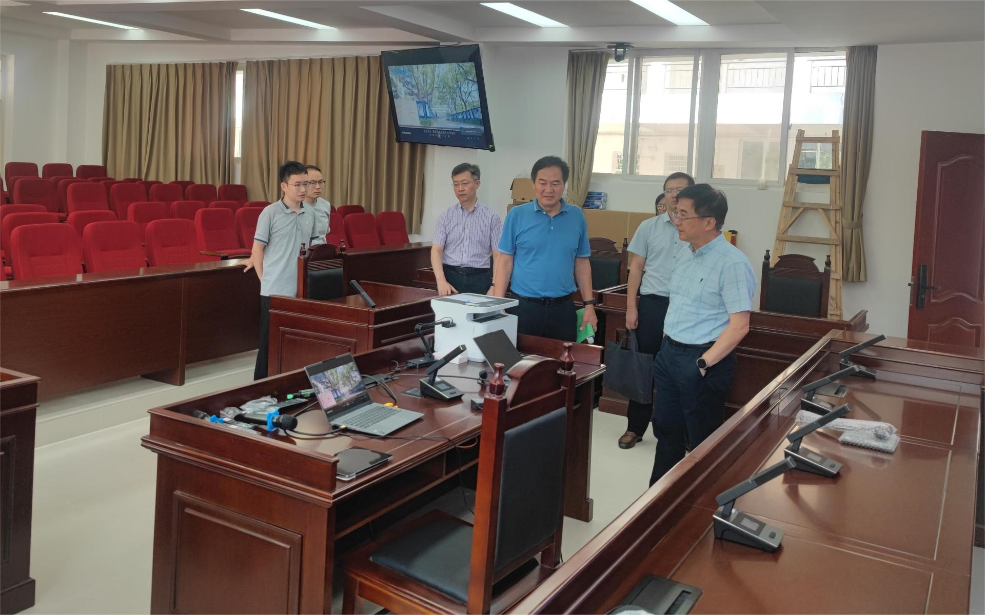 数字智能化升级改造后的模拟法庭。王校长简要询问了模拟法庭的数字设备配置运行情况和使用效果,并就新时代法律人才培养标准、法学实践教学基地建设和毕业生就业等问题与含羞草