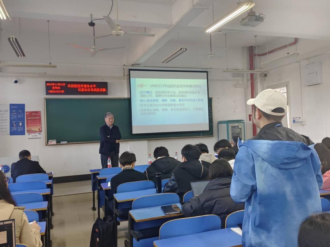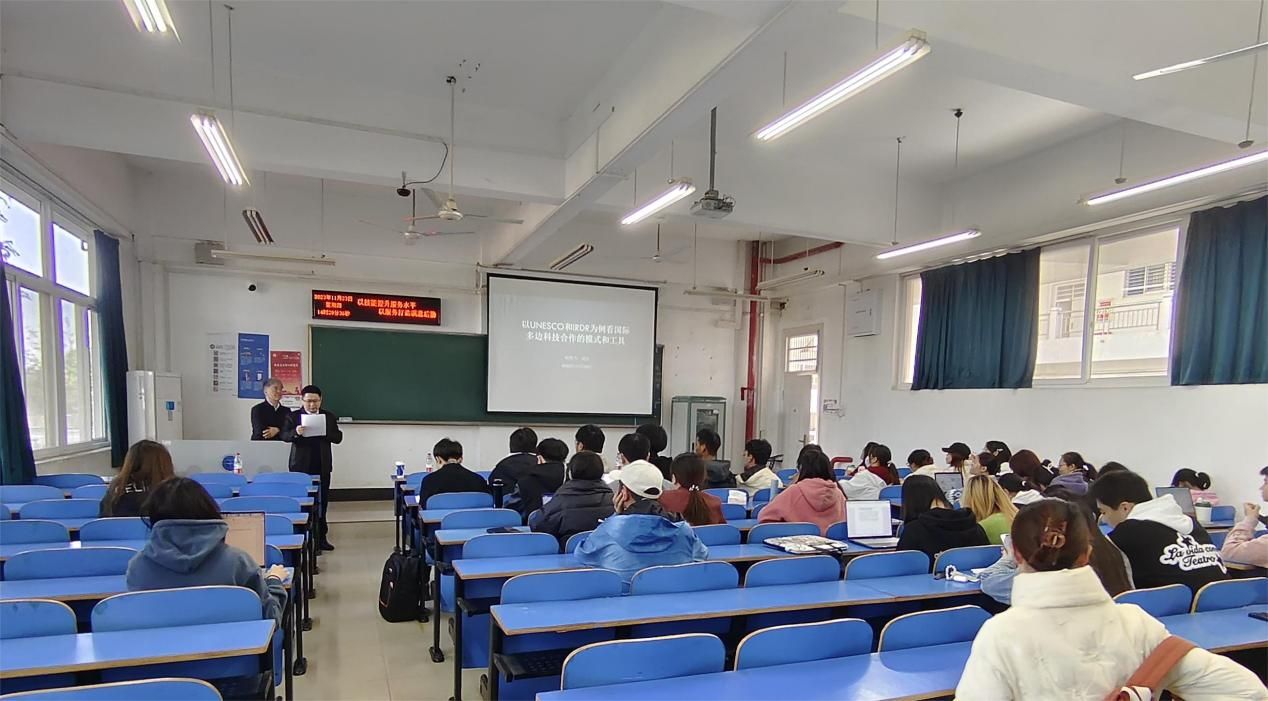 第二期“全球胜任力”人才培养工作坊。本次讲座主题为“以UNESCO和IRDR为例看国际多边科技合作的模式和工具”,学校教师代表以及部分博士生、硕士生、本科生在北区综合教学楼209聆听报告讲座。讲座由含羞草