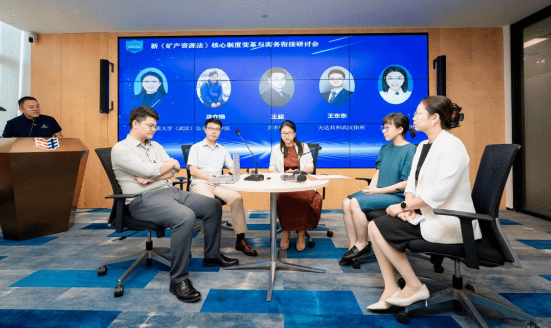 在圆桌讨论环节,在学院张旭鹏老师主持下,吕凌燕、涂亦楠副教授与来自湖北立丰、北京天达共和(武汉)以及北京市兰台(武汉)等律师事务所的王超、王冬冬、陈晨律师,从理论与实务不同视角探讨了“权证分离”、“探转采”直通车、矿业权出让收益重复征收、矿业用地、生态修复基金适用及非法采矿认定等新旧矿法理解与适用的重难点问题。各位嘉宾视角虽有不同,但思想的碰撞促进了“如何更好地理解、运用新法,推动矿产资源治理体系和治理能力现代化”这一目标的实现。