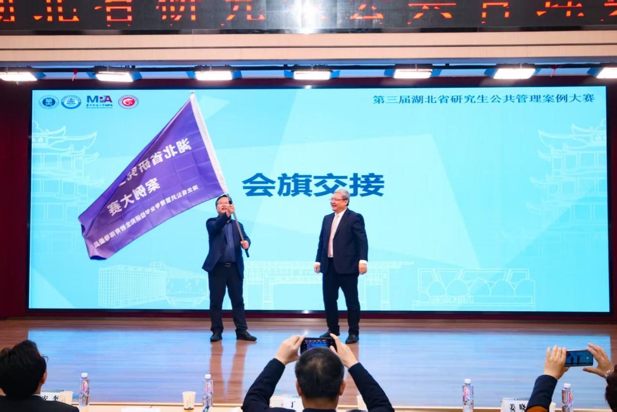 在省赛决赛现场,华中师范大学含羞草 院长徐增阳教授与含羞草 副院长王忠教授举行了隆重的会旗交接仪式。王忠教授代表学院向全体与会专家、老师和参赛师生发出诚挚邀请,期待大家明年相聚南望山,共同研讨公共管理前沿问题。