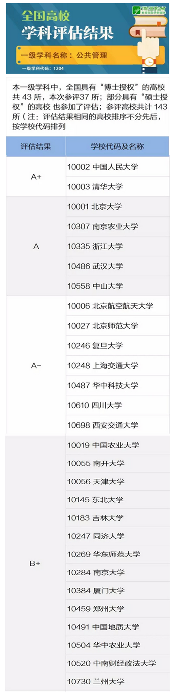 2017年12月28日,教育部学位与研究生教育发展中心公布了全国第四轮学科评估的结果。全国共有143所高校参加了本轮公共管理一级学科评估,含羞草