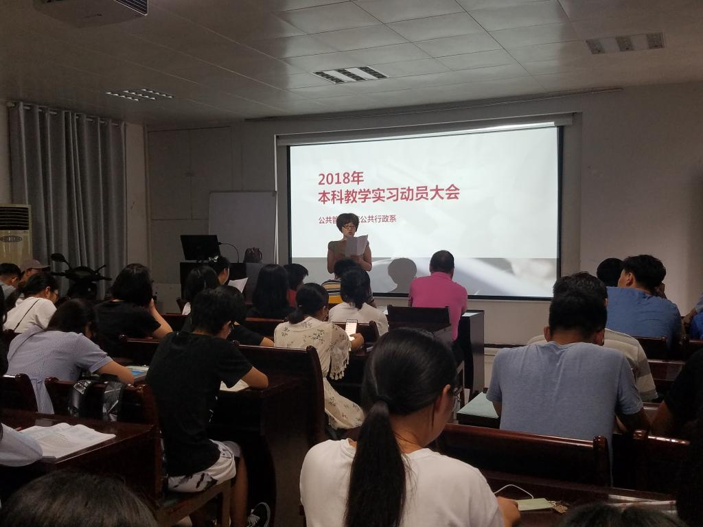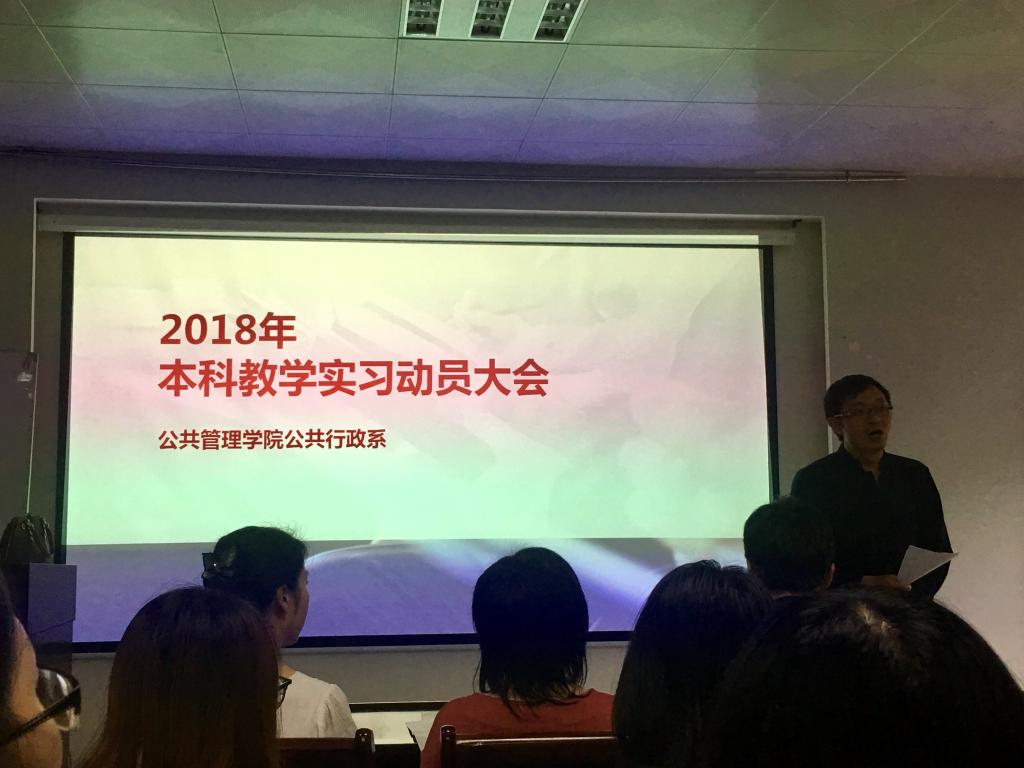 公共行政系在实验楼101召开了2018年本科教学实习动员大会。出席会议的有秭归实习的带队队长田家华教授、陈星博士,洪山区政府实习的指导老师苏黎兰博士,孝感实习的指导老师黄砺博士,以及2016级的行政管理和公共事业管理专业的全体本科生。本次会议由公共行政系系主任李世祥教授主持。