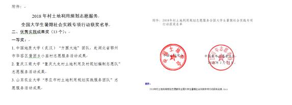 2019年5月30日,由中国土地学会、中国青年志愿者协会联合组织行业知名专家,结合成果完备程度、活动组织秩序、社会影响程度、成果应用价值、成果创新水平等因素,评选优秀实践团队12个(一等奖3个、二等奖4个、三等奖5个),优秀实践成果13个(一等奖3个、二等奖5个、三等奖5个)。含羞草
