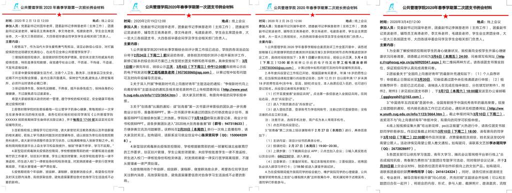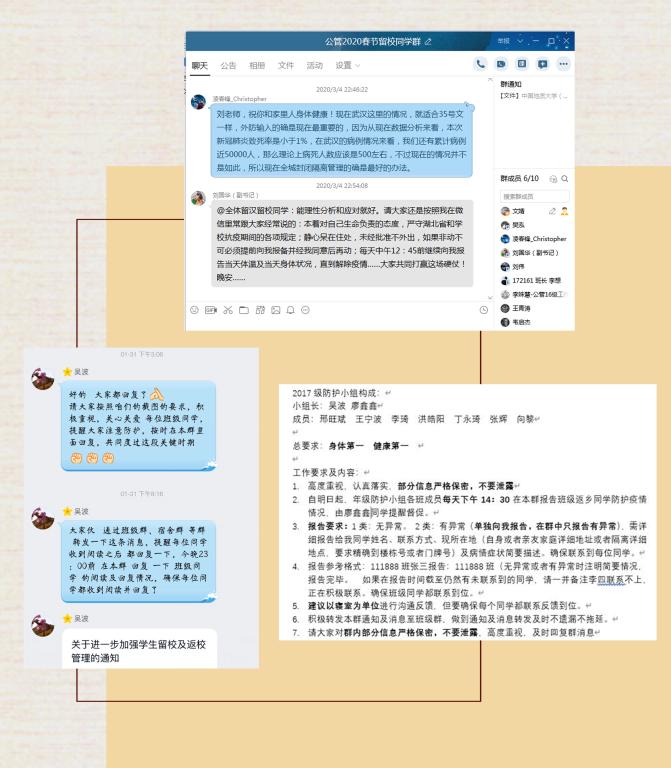 为更有效地开展工作,学院明确分工,实现教育、服务、管理、引导全程覆盖。发展引导实现两个结合,结合纵向年级需求,开展针对性指导;结合横向专业特征,开展特色化引导,守好教育责任田。教育层面守好两个课堂,一方面专业老师保证授课质量,守好第一课堂,同时德育工作组适时开展活动,丰富第二课堂。服务层面落实“两个关心”:关心受疫情影响的贫困学生,及时助力;关心受疫情影响的情绪困惑学生,及时疏导。做好后勤保障,隔空送温暖,千里仍温馨。日常管理做到“两个覆盖”:持续开展线上主席团例会、班团例会、主题党团会,及时传达最新要求,确保通知信息各班级、各同学全覆盖。