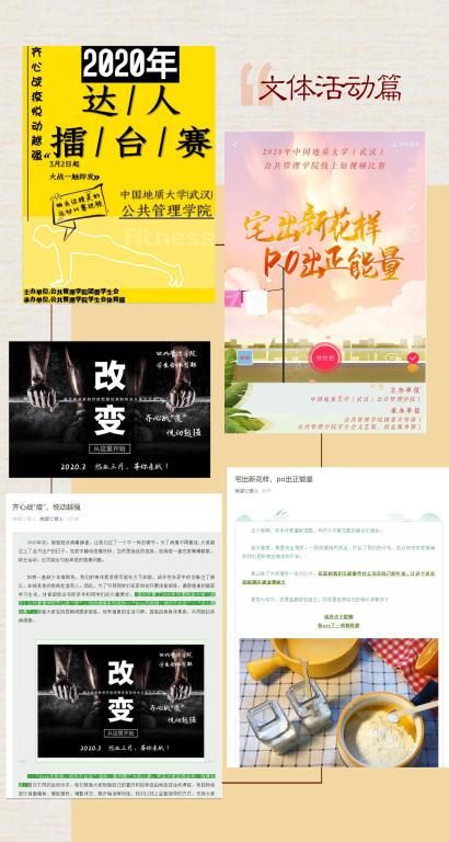 体美双管齐下,身心健康战疫情。针对疫时的“宅”现象,学院开展体育引导,策划“齐心战‘疫’,悦动越强”健身活动,号召学生强身健体、提高免疫、共胜疫情。针对疫时无法出门的焦虑与烦躁情绪,开展美育引导,策划“宅出新花样,魄出正能量”微视频大赛,号召学生记录生活中的美好瞬间,以视频为载体,传递温馨,积极应对疫情。