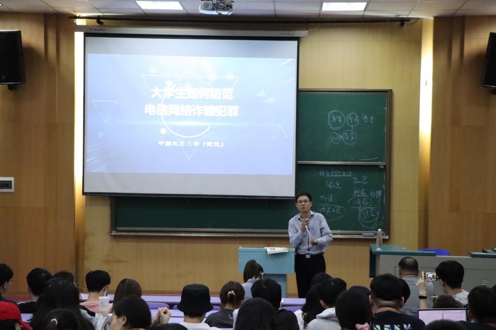 之后,单处长大力提倡同学们认真学习“地大保卫”提供的网上防诈骗课程,相信大家学完以后一定大有收获。最后,单处长强调,如果遇到诈骗,不要慌张,要及时向老师和学校反映,及时报警,并以一句话作为总结——“绷紧防范弦,捂紧钱袋子”。