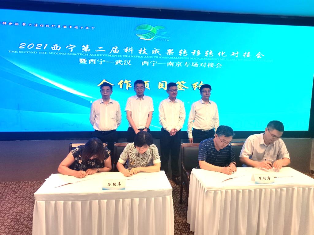 党委副书记刘国华作为嘉宾,与西宁市副市长陈爱红等五人共同按下了“2021年西宁第二届科技成果转移转化对接会——暨西宁-武汉 西宁-南京专场对接会”开幕按钮。开幕式后,本着建立长期、紧密的合作关系,刘国华副书记与李为民副局长分别代表含羞草